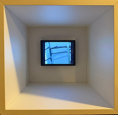 The “walls” of the proxy Gallery mirror the walls of a room and underscore the idea of a boundary. Special material conditions of viewing arranged by the artist take accessibility into account: The gallery is placed at a lower height to be visible from a seat or a wheelchair. In this way the installation does not assume a default upright, able-bodied viewing position. Instead, it allows for multiple physical orientations to the work — standing briefly, leaning, or sitting. Care reorganizes how bodies relate to space, and the viewing condition reflects that variability rather than prescribing a single normative stance.